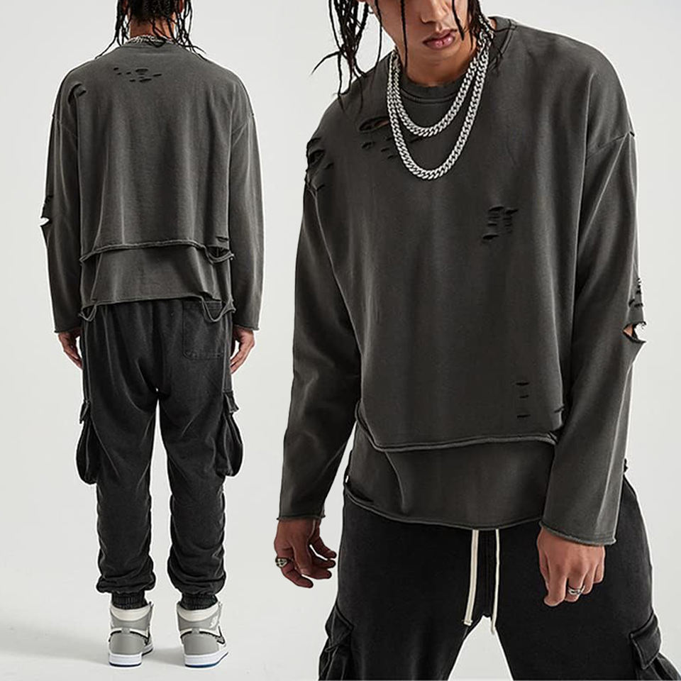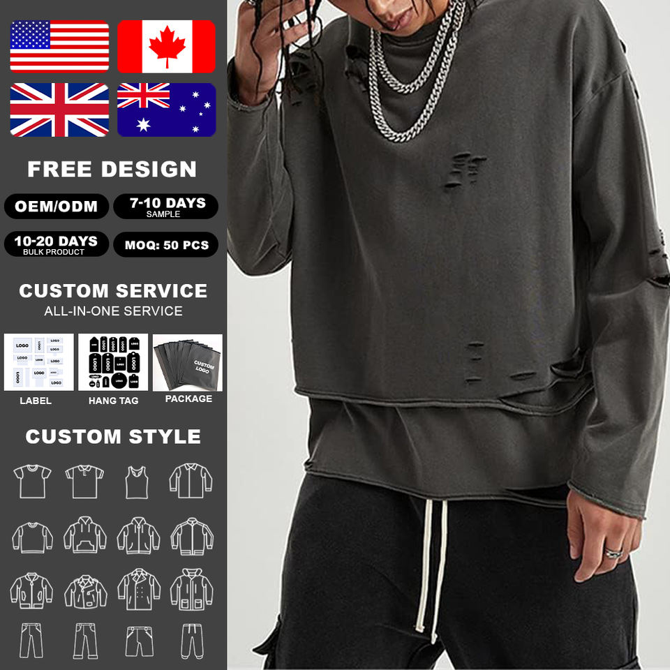 เสื้อยืดแขนยาวผู้ชาย KingSen สไตล์วินเทจ สองชั้น ผ้าดิบ ทรงหลวม คอวี ตัดเย็บแบบดิบ เป็นมิตรต่อสิ่งแวดล้อม ผ้าฝ้าย 100%