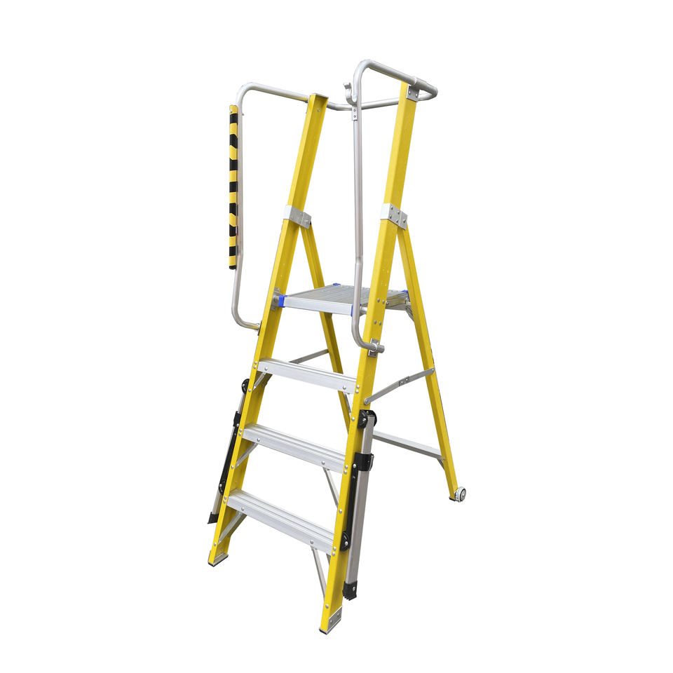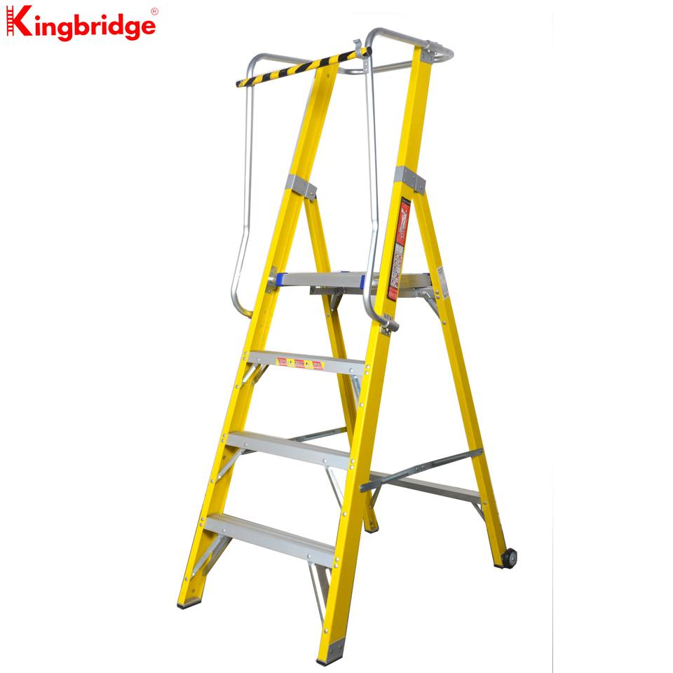 บันไดเคลื่อนที่คิงบริดจ์คุณภาพสูง 4 ขั้น ทำจากไฟเบอร์กลาส พร้อมราวจับสีเหลือง ดีไซน์สไตล์อุตสาหกรรม รองรับน้ำหนักได้ มาตรฐาน EN131