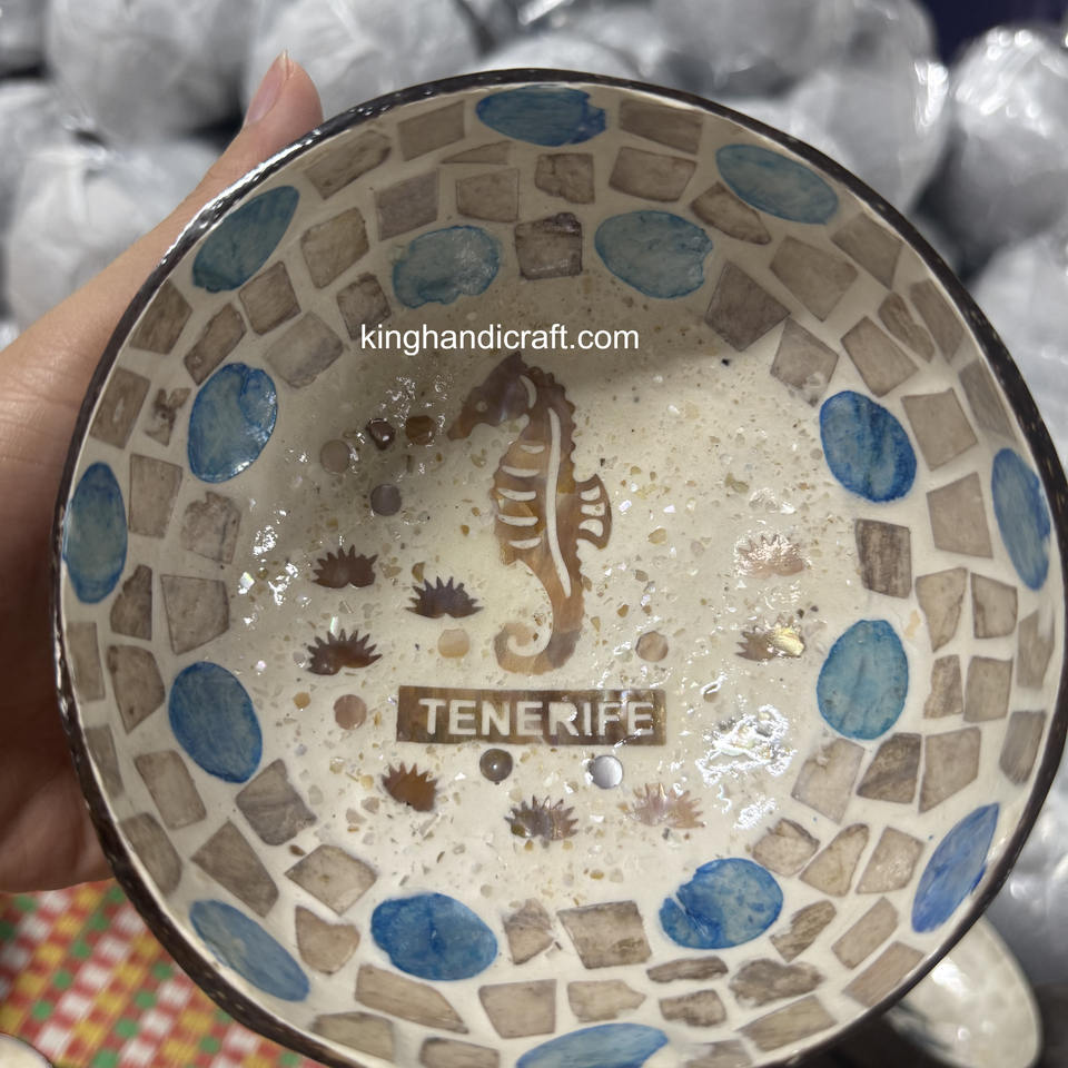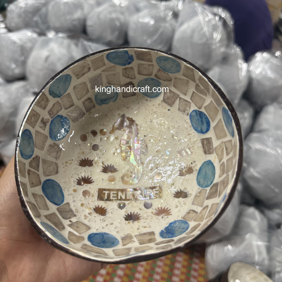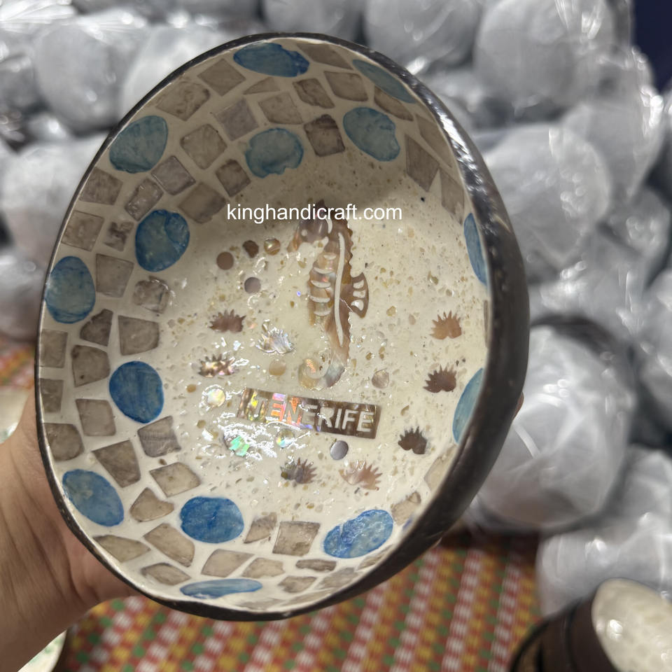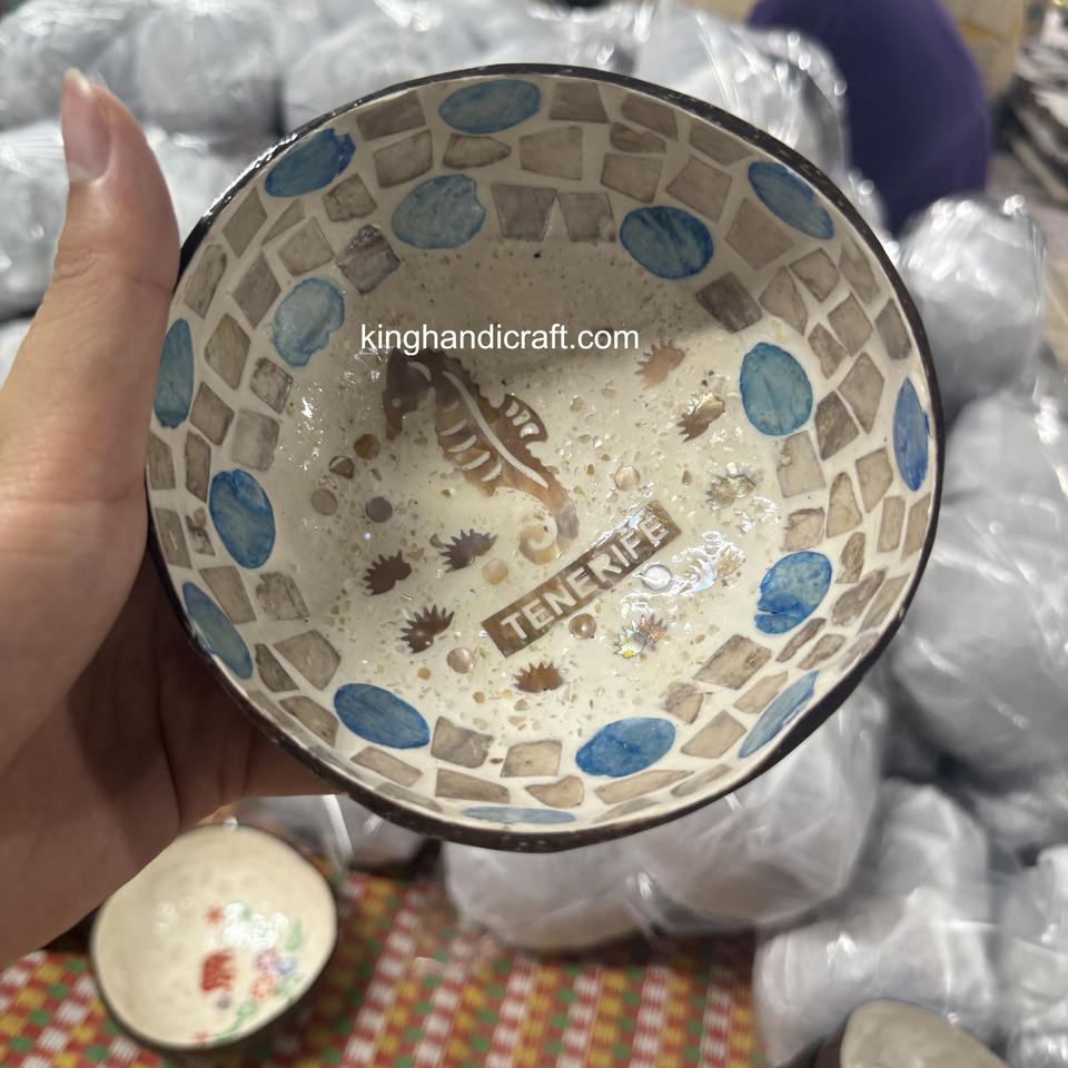 ชามพร้อมศิลปะเคลือบเงาทำจากเปลือกมะพร้าวธรรมชาติทำด้วยมือของ kingcraft ชามเสิร์ฟเป็นมิตรกับสิ่งแวดล้อมจากเวียดนาม