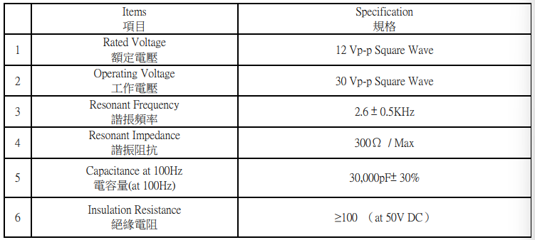 ลักษณะ:อิเล็กโทรดเพียโซทองเหลือง 35 มม. 2 ขา 2.6KHz