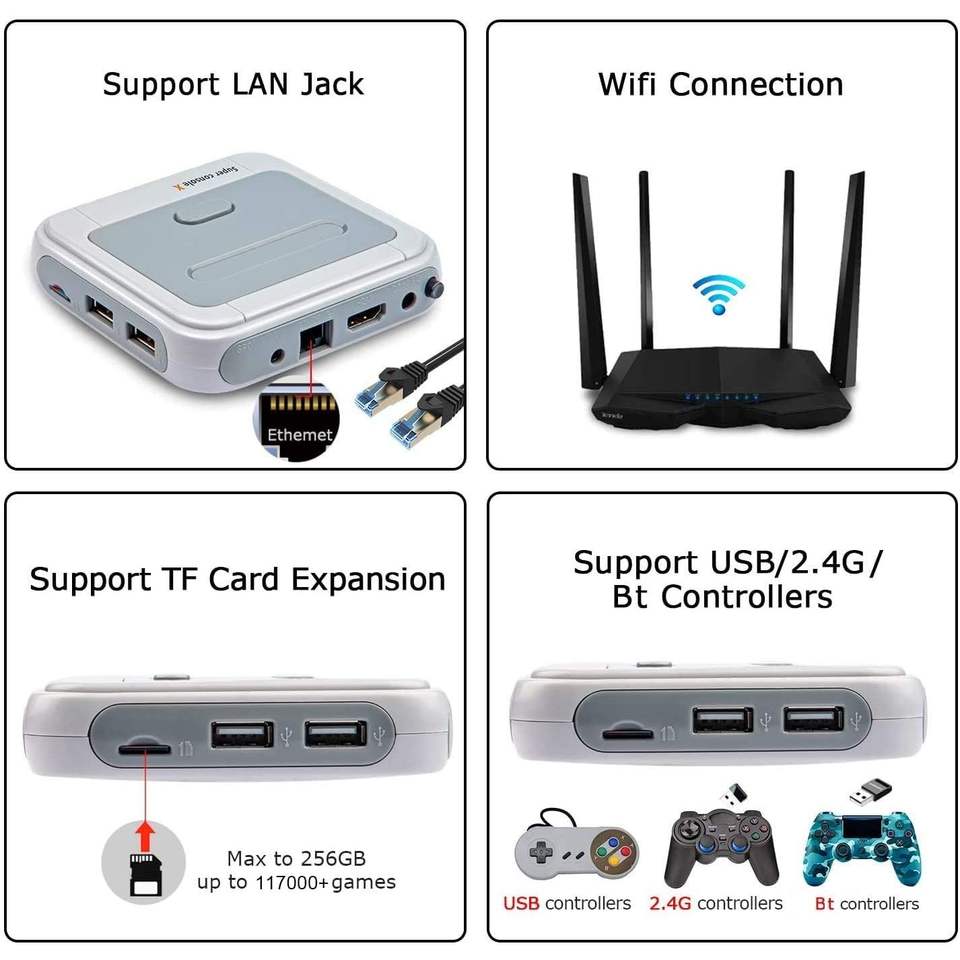สนับสนุนผู้เล่นหลาย, สนับสนุนเครือข่ายดาวน์โหลดเกม, สนับสนุนภาษา, ความเร็วเกม FPS 1:1เอาต์พุต, พร้อม Wireless Controller