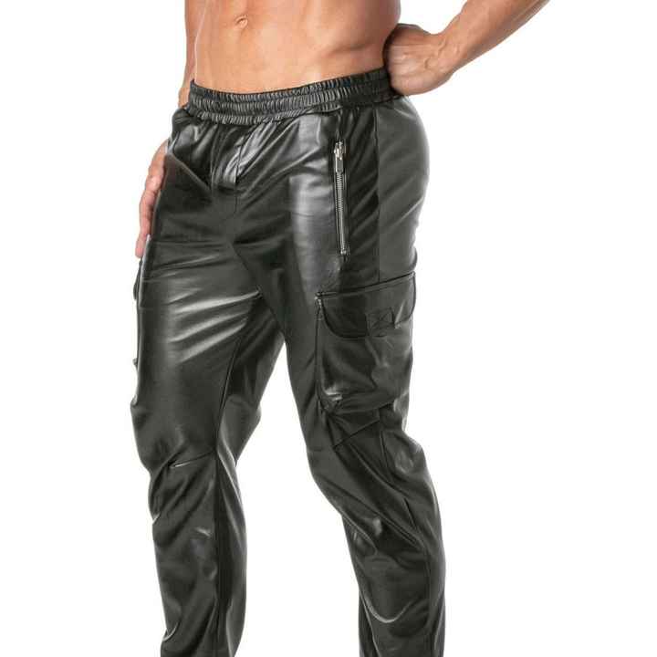 กางเกงวอร์ม Kinky Cargo สำหรับผู้ชาย สีดำ หนัง แต่งเชือกผูก น้ำหนักเบา สไตล์สตรีทแวร์ คลับแวร์ ทรงเข้ารูป มีกระเป๋าอเนกประสงค์