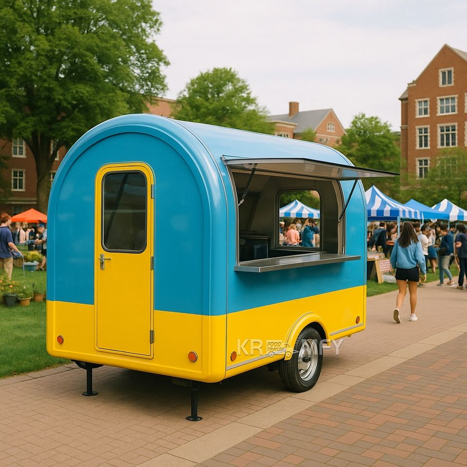 รถขายอาหารเคลื่อนที่แบบคีออสก์ ทำจากไฟเบอร์กลาส พร้อมฟังก์ชั่นหลากหลายสำหรับขายไอศกรีม ขนมขบเคี้ยว และมันฝรั่งทอด เหมาะสำหรับธุรกิจอาหารจานด่วน