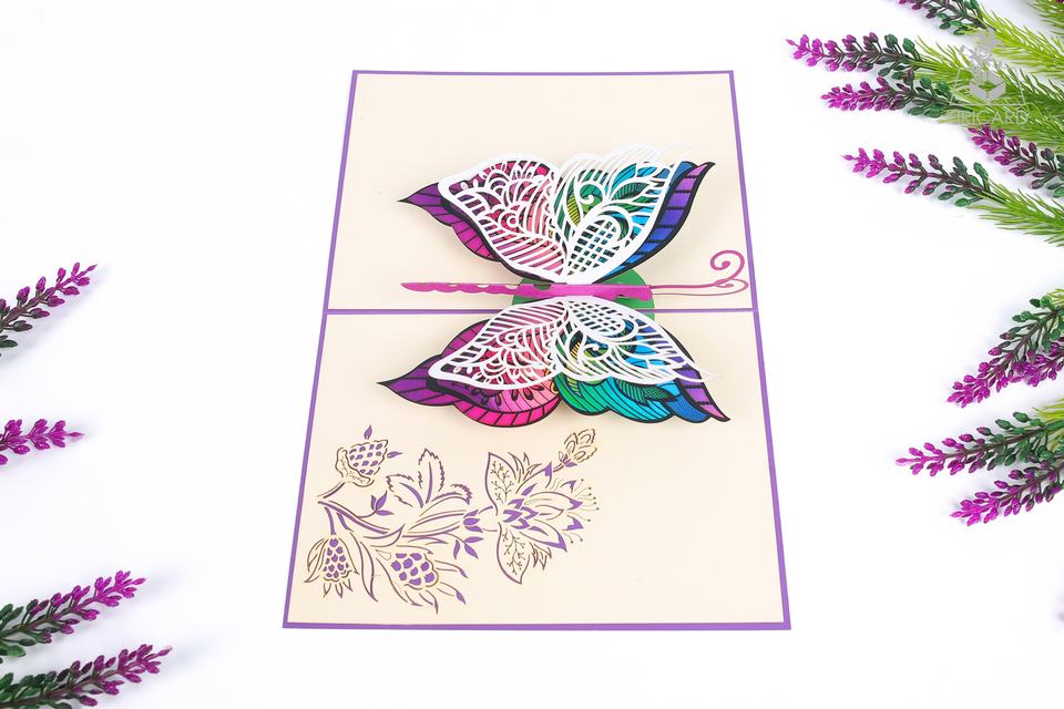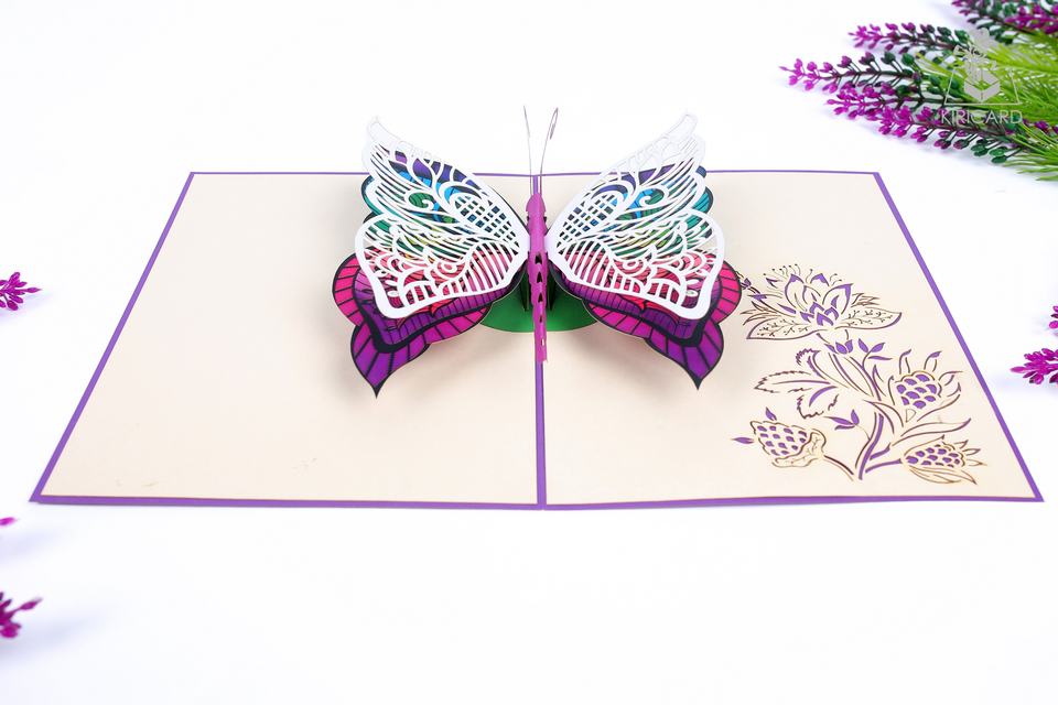 การ์ดป๊อปอัพ3D Kiricard ทำด้วยมือการออกแบบผีเสื้อที่ซับซ้อนด้วยการพิมพ์ที่สวยงามทำจากกระดาษหัตถกรรมเวียดนาม