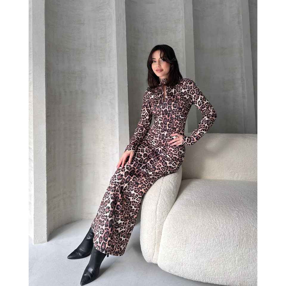 เดรสยาวคอวีทรงเข้ารูปเอวสูงลายพิมพ์สีน้ำตาล ชุดราตรีสวมใส่สบาย