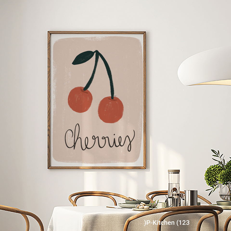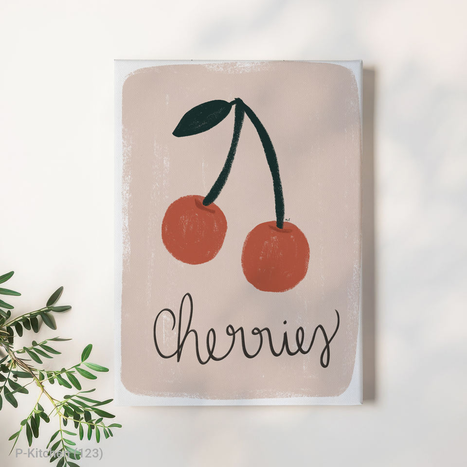 ภาพพิมพ์บนผ้าใบสำหรับห้องครัว, โปสเตอร์ภาพประกอบตัวอักษรผลไม้เชอร์รี่น่ารัก, ของตกแต่งผนังห้องครัวสไตล์สแกนดิเนเวียน