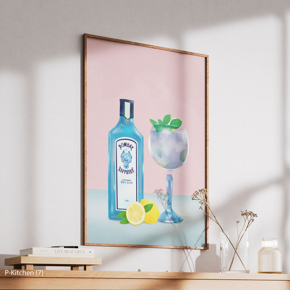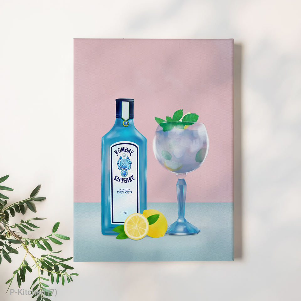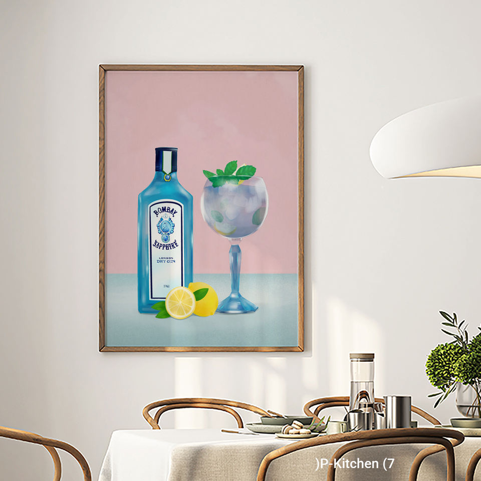 ภาพศิลปะบนผืนผ้าใบสำหรับตกแต่งห้องครัว, โปสเตอร์ภาพประกอบขวดบลูจินและเครื่องดื่มรสส้ม, ภาพพิมพ์ตกแต่งผนังสไตล์โมเดิร์นสำหรับเครื่องดื่ม