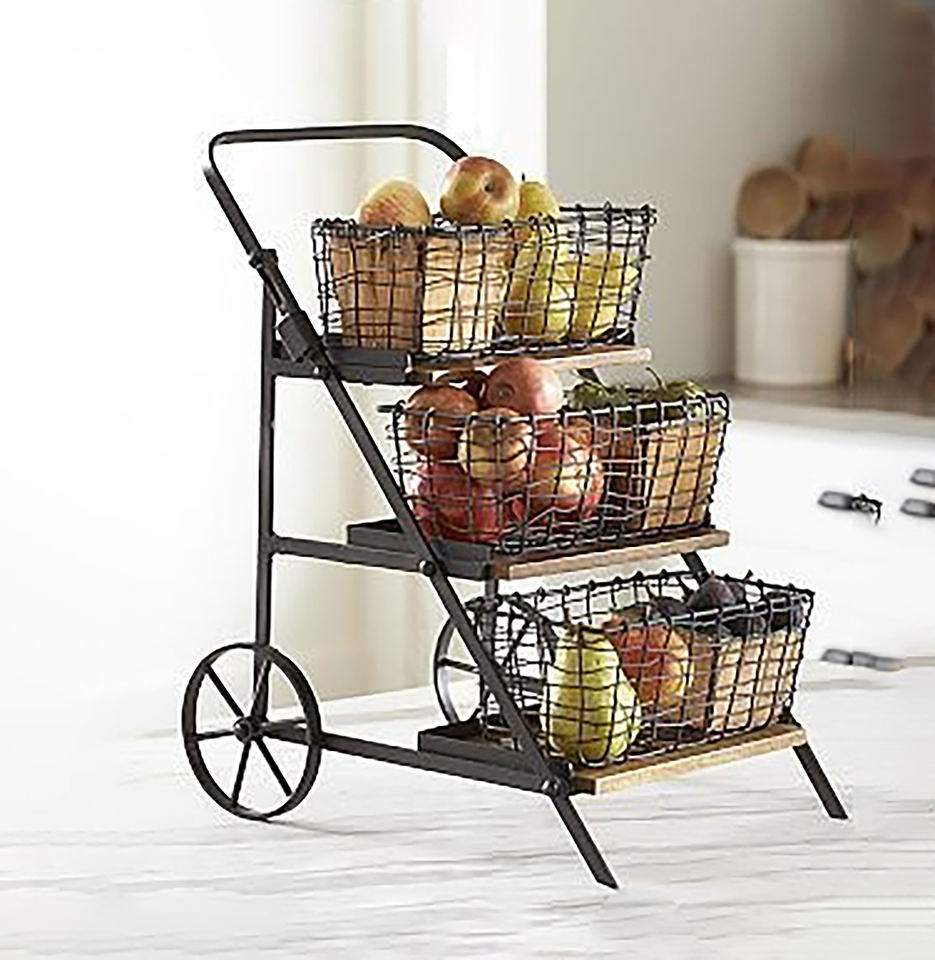 ตะกร้าเก็บผักผลไม้โลหะสองชั้นสำหรับวางบนเคาน์เตอร์ครัว สีโรสโกลด์