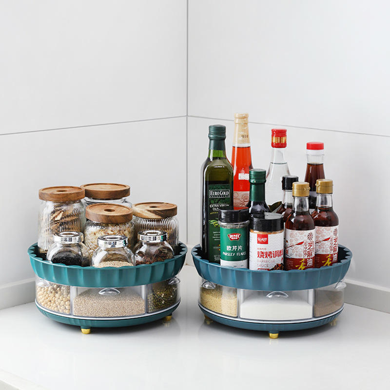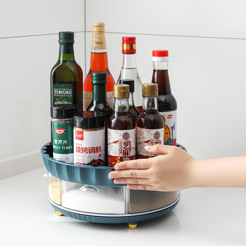 ชั้นวางเครื่องเทศแบบหมุนได้สำหรับวางบนเคาน์เตอร์ครัว แบบสองชั้น สำหรับเก็บเครื่องปรุงรส น้ำมัน เกลือ ซอส ซีอิ๊ว น้ำส้มสายชู