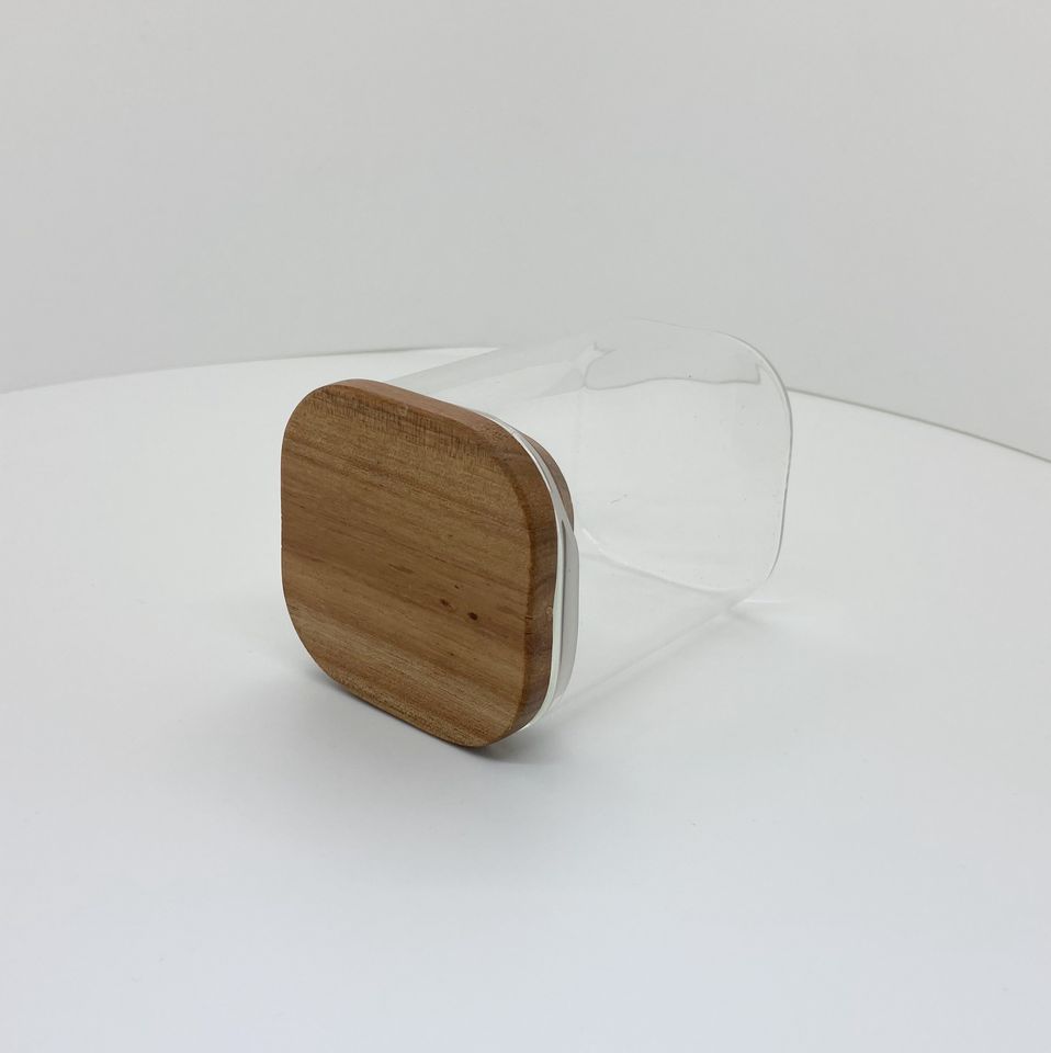 ขวดโหลทรงแบนแบบกำหนดเองสำหรับห้องครัว พร้อมฝาไม้ทรงสี่เหลี่ยม สำหรับขวดโหลแก้วโบโรซิลิเกต ใช้เก็บอาหารและเครื่องเทศ