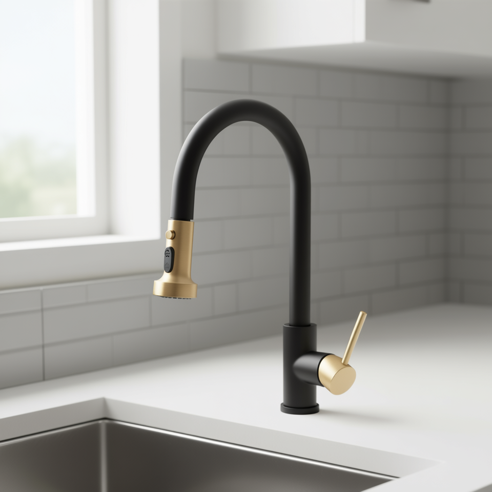 ก๊อกน้ำห้องครัว สีดำด้าน ทองขัดเงา แบบดึงลง ด้ามจับคู่ วาล์วเซรามิก ติดตั้งบนเคาน์เตอร์ สไตล์ร่วมสมัย