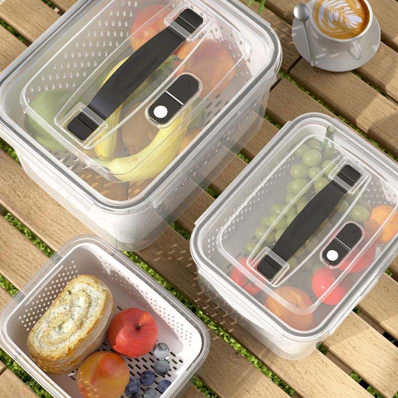 ชุดจัดระเบียบในตู้เย็นสำหรับห้องครัวกล่องใส่ผักผลไม้พร้อมฝาปิดและตะกร้าสะเด็ดน้ำ