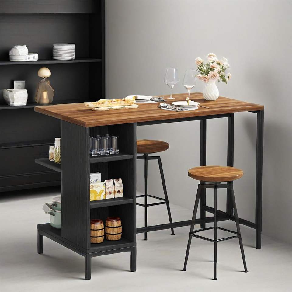 เคาน์เตอร์ครัวแบบเกาะกลางพร้อมโต๊ะบาร์ มีชั้นวางของแบบเปิด 5 ชั้น และพื้นที่เตรียมอาหารขนาดใหญ่ ผลิตภัณฑ์เคาน์เตอร์ครัวแบบเกาะกลางและรถเข็นครัว