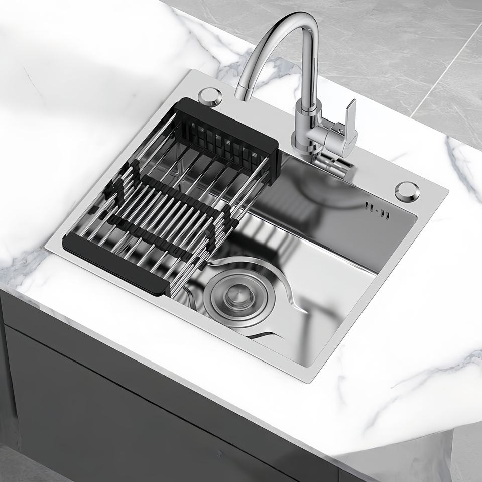 อ่างล้างผักแบบอ่างเดี่ยวขนาดใหญ่สำหรับห้องครัว ทำจากสแตนเลสหนา ผลิตด้วยมือ แบบฝังใต้เคาน์เตอร์