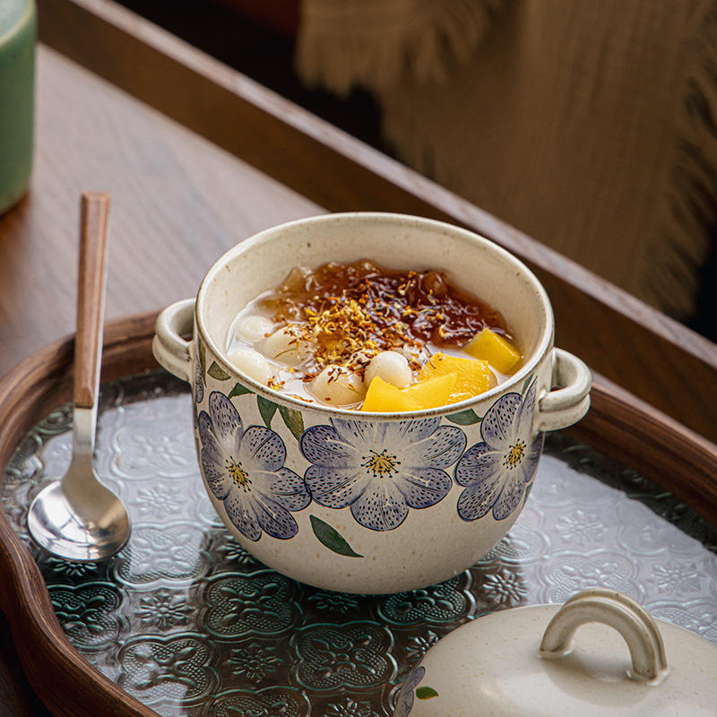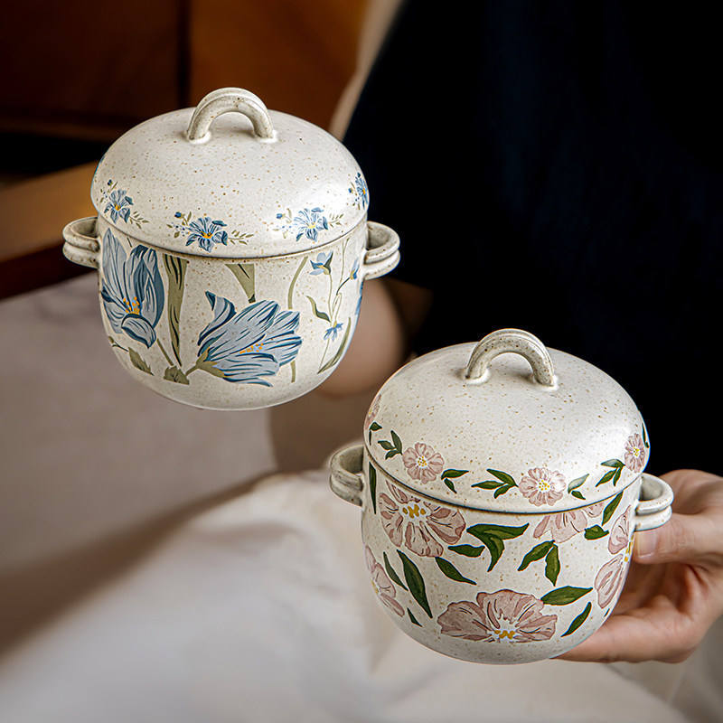 หม้อตุ๋นเซรามิกแบบจีนโบราณสองหูจับ กันน้ำ ฝาปิดลายดอกไม้ ส่งออกต่างประเทศ