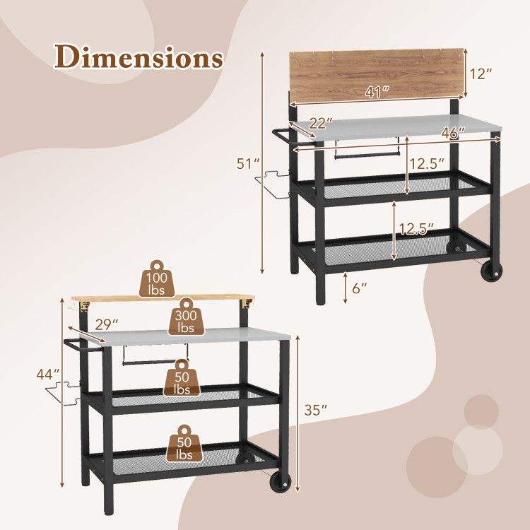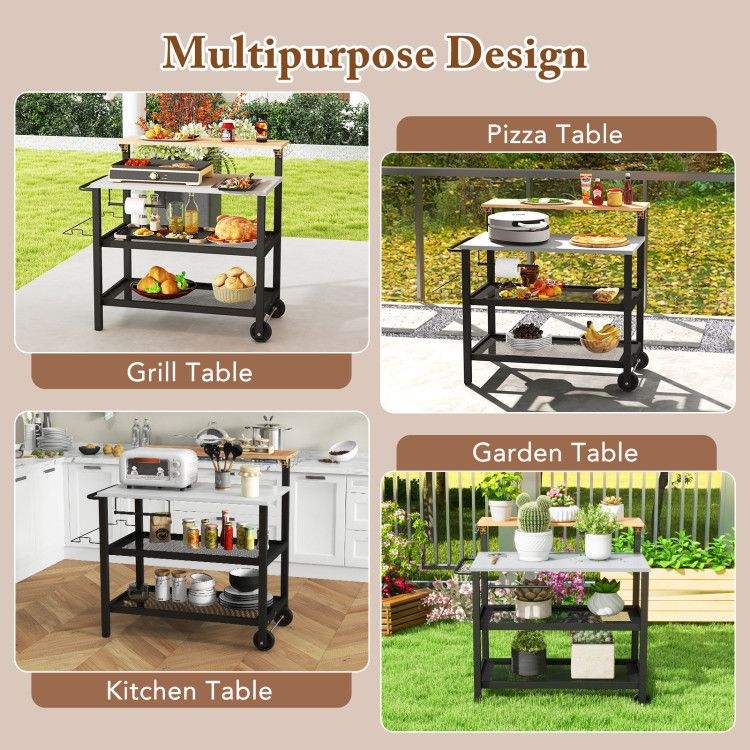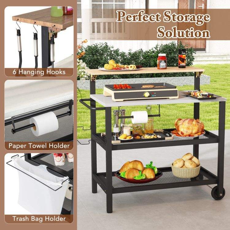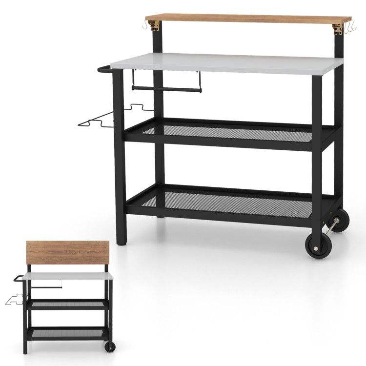 รถเข็นบาร์ในครัวพร้อมโต๊ะพับและตะขอเกี่ยว เฟอร์นิเจอร์สำหรับลานบ้าน