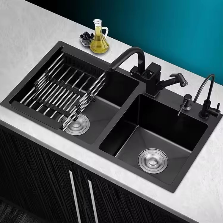 อ่างล้างจานแบบคู่ทำจากสแตนเลส SUS304กันสนิมอ่างล้างจานแบบโมเดิร์นด้านล่างสีดำ5ปีผู้ผลิตจากโรงงานขายส่ง