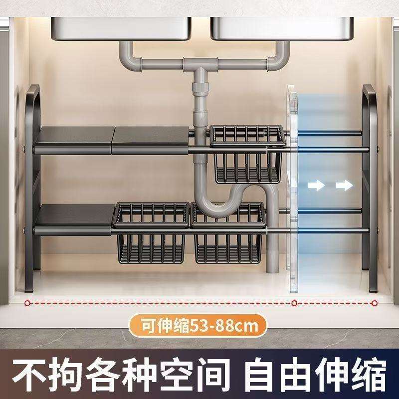 ชั้นวางของใต้ซิงค์ครัวแบบหลายชั้น ขยายได้อเนกประสงค์ รูปทรงสี่เหลี่ยมผืนผ้า แบบตั้งพื้น