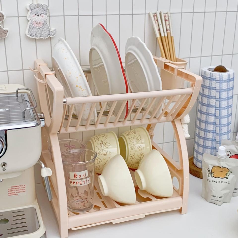 ชั้นวางของในครัวสำหรับจาน ชาม ตะเกียบ มีด-ชั้นวางแบบสองชั้นอเนกประสงค์ พร้อมที่ระบายน้ำ ผลิตจากพลาสติกที่เป็นมิตรกับสิ่งแวดล้อม