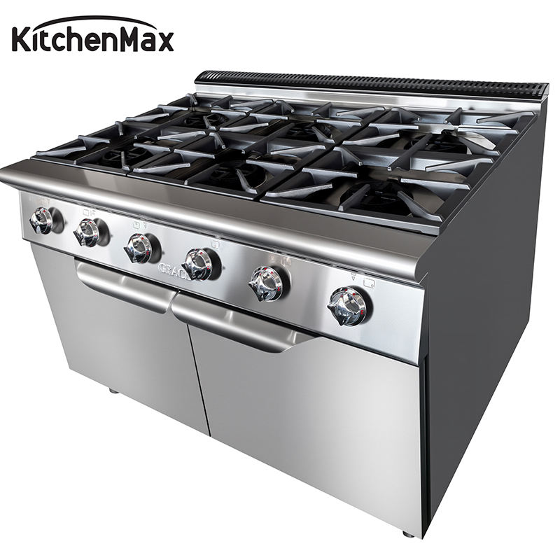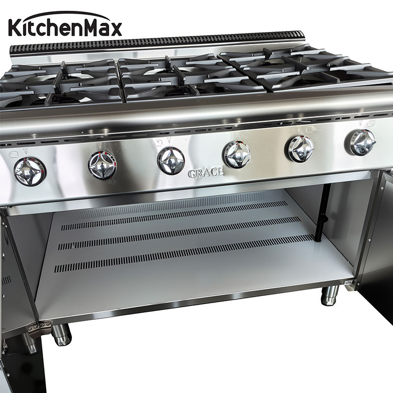 เตาแก๊สแบบตั้งพื้น KitchenMax สำหรับร้านอาหารตะวันตก พร้อมเตา 6 หัว และตู้เก็บของ