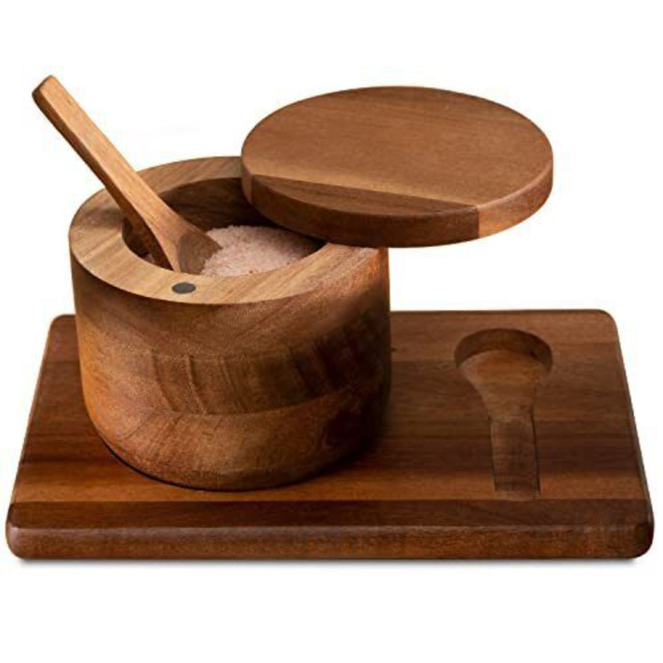 ชุดชามเกลือและพริกไทยคุณภาพเยี่ยม พร้อมถาดและช้อน ชุดชามน้ำตาลไม้แท้แบบกำหนดเองได้ เหมาะสำหรับอุปกรณ์ครัว