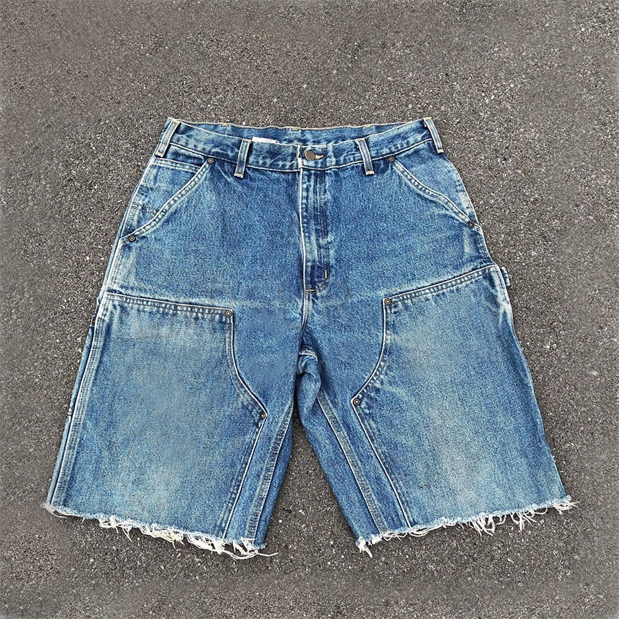 Kivotech กางเกงยีนส์ฟอกสีแบบวินเทจกางเกงขาสั้นทรงหลวมใส่สบายโลโก้/พิมพ์ลาย