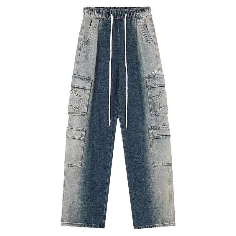 Kivotech กางเกงยีนส์ฮิปฮอปสำหรับผู้ชาย, กางเกงยีนส์ขาหลวมสีไล่ระดับสีมีกระเป๋า