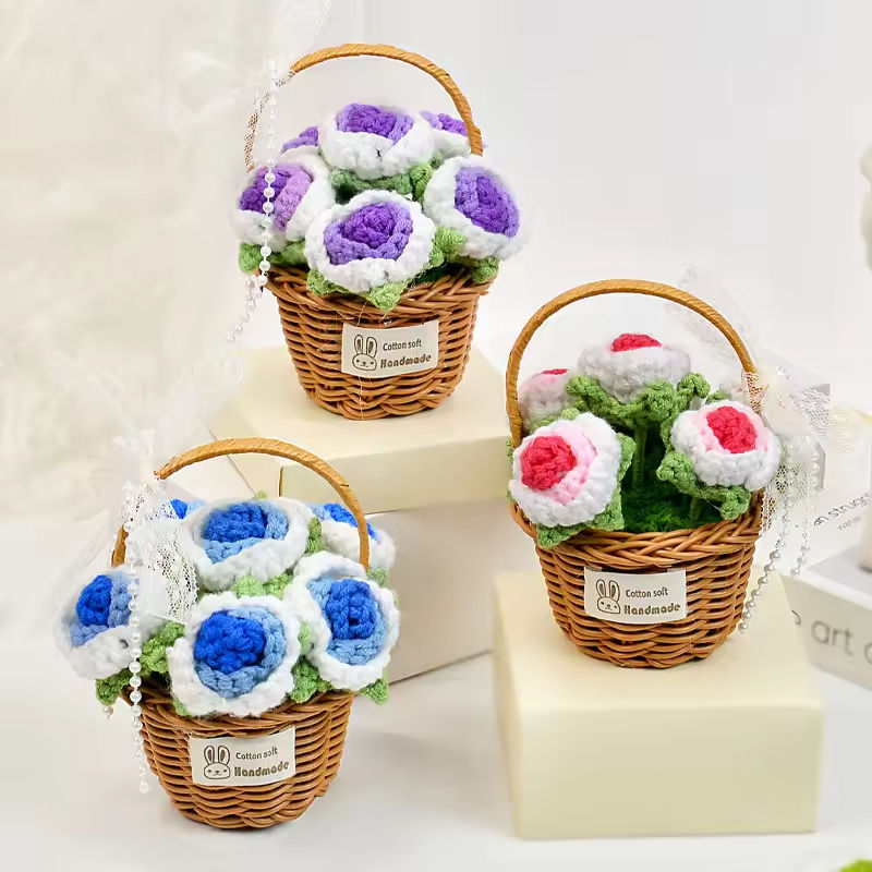 ช่อดอกไม้ถักไหมพรมสำเร็จรูป ของที่ระลึก ดอกกุหลาบแดง ดอกไม้ไหมพรมตกแต่ง ตะกร้าดอกไม้พกพา