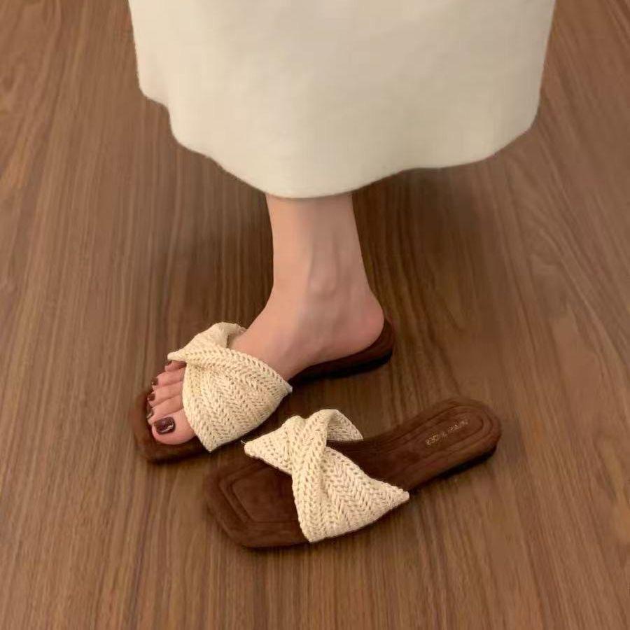 Anti-Slippery Breathable Knitted One Piece Flip Flops Comfortable for Sandy Beaches Seaside Leisure Flat Bottomed Square Toe