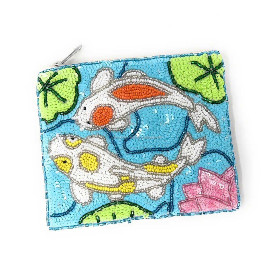 กระเป๋าใส่เหรียญปักลายปลาคาร์ฟประดับลูกปัด งานแฮนด์เมด กระเป๋าคลัทช์ประดับเลื่อมสีฟ้า ลายดอกบัว ดีไซน์สไตล์ญี่ปุ่น กระเป๋าซิปแบบยูนิเซ็กส์