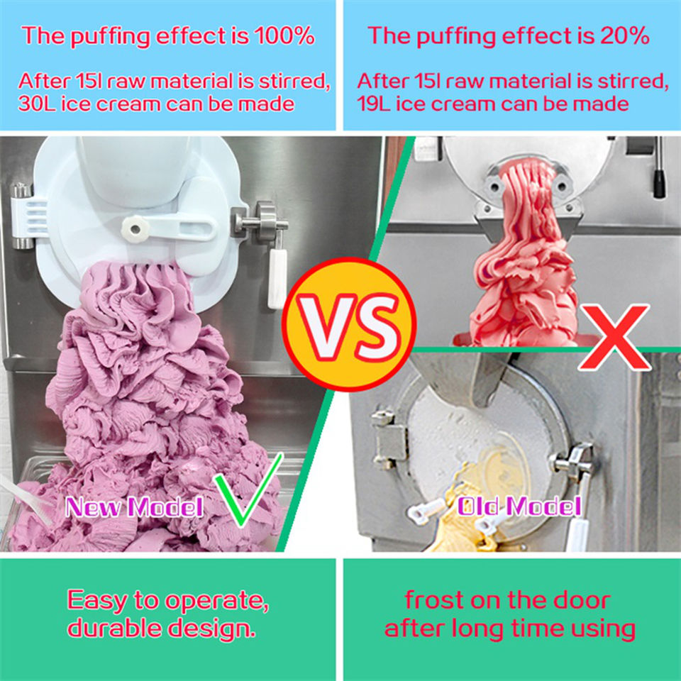 เครื่องทำไอศกรีมสแตนเลสใหม่ ผลิตภาพสูง ใช้ผลไม้และนมเป็นวัตถุดิบ ได้รับการรับรองมาตรฐาน CE กำลังการผลิต 25-36 ลิตร/ชม. ใช้ไฟ 110/220V