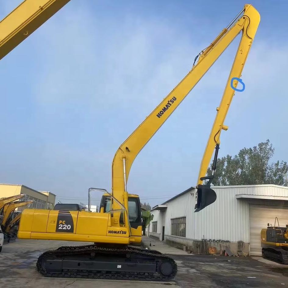 รถขุดโคมัตสึ PC220 พร้อมอุปกรณ์ต่อแขนยาว/ขยายแขน รถขุดมือสองพร้อมเครื่องยนต์คัมมินส์และปั๊มสำหรับรุ่น PC110/130/160/200/300