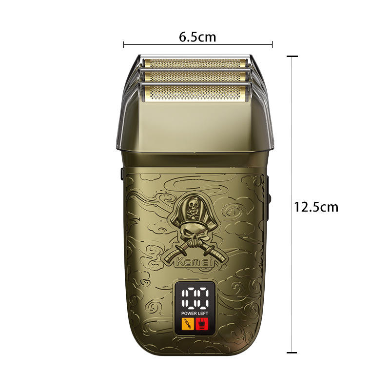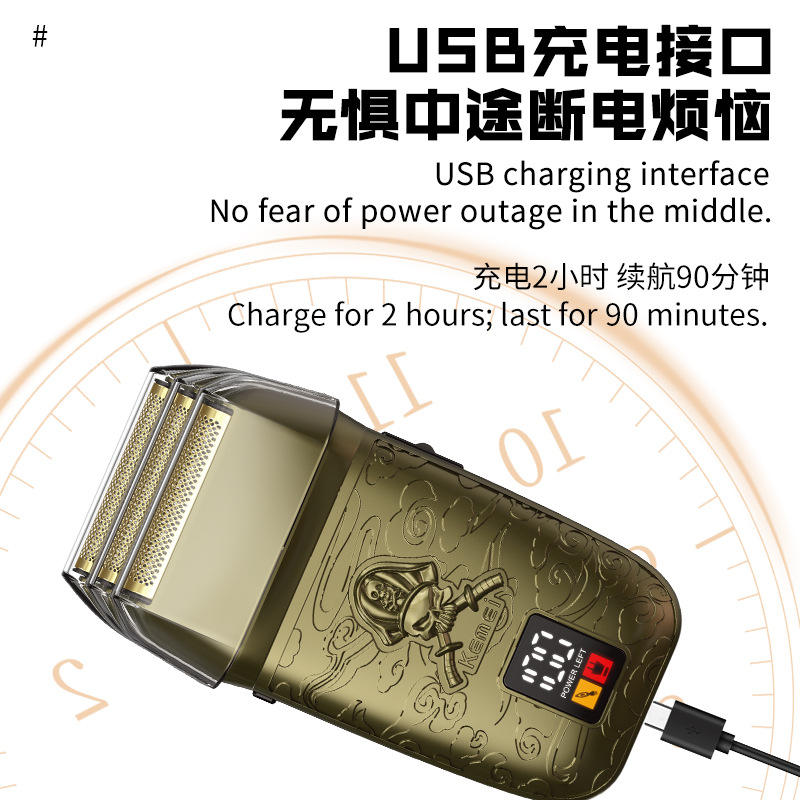 เครื่องโกนหนวดไฟฟ้าโคเมอิสำหรับผู้ชาย KM-T361 ตัวเครื่องโลหะ IPX7 กันน้ำ ชาร์จ USB ใช้งานได้ 60 นาที มีดโกนแบบลูกสูบ