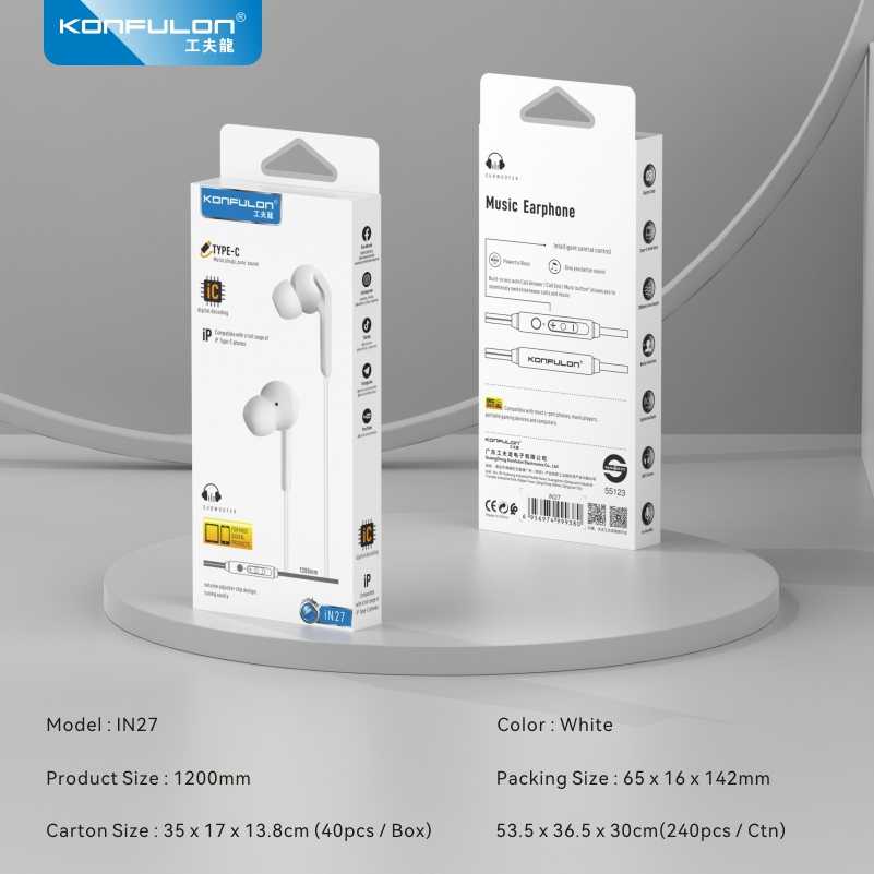 Konfulon 2024 ใหม่บรรจุเดิม Type-C หูฟังสเตอริโอชนิดใส่ในหูหูฟังแบบมีสายพร้อมไมโครโฟนสําหรับ Xiaomi, OPPO, OnePlus