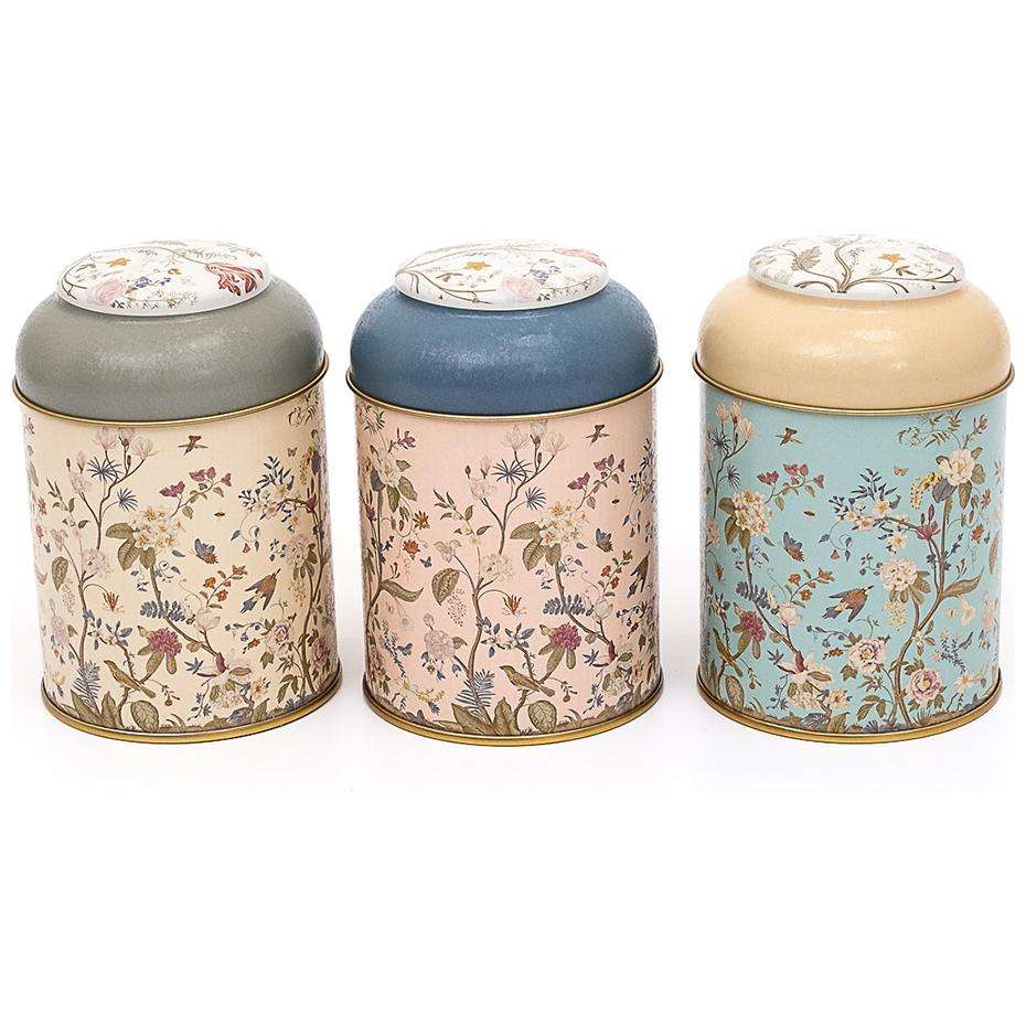 ชุดกระป๋องโลหะคอนเทนซาน ขนาด 90x100 มม. (ชุด 3 ชิ้น) พร้อมฝาโดม ลายดอกไม้ สีพาสเทล น้ำเงิน โบตานิก้า