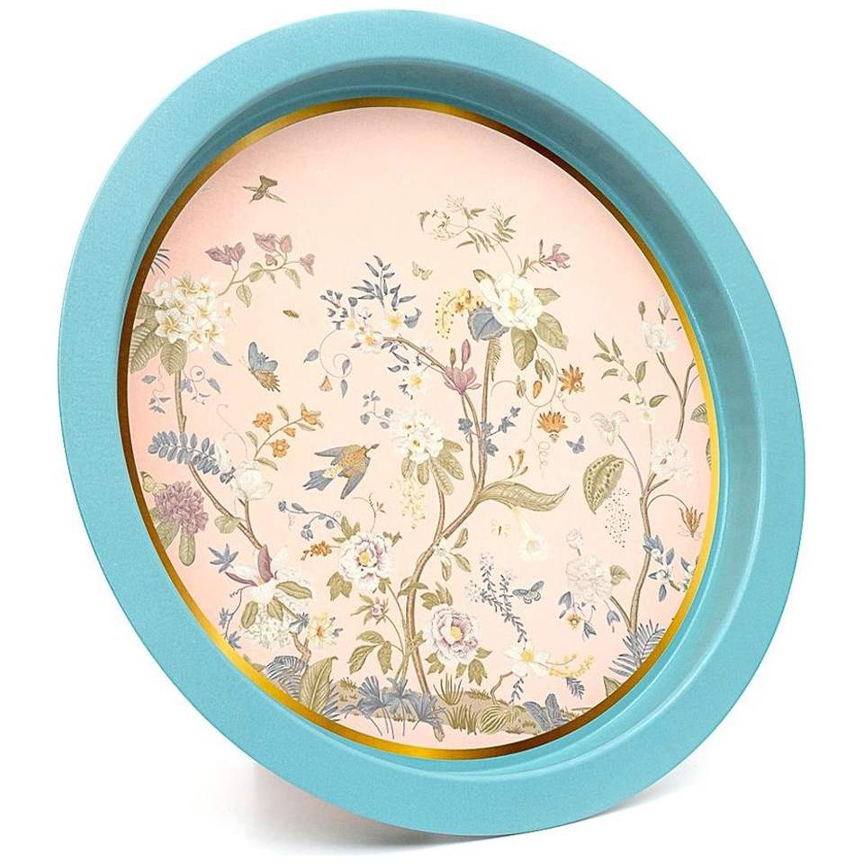 Kontensan Pastel Blue Floral Design Metal Wood Serving Tray 370mm Large Decorative Features Made MDF Mother Pearl Leather Model