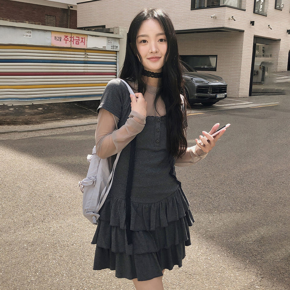 ชุดเดรสสั้นสไตล์เกาหลีประดับลูกไม้แบบแพทช์เวิร์ค คอร์เซ็ท กระโปรงทรงเค้กแบบญี่ปุ่นสไตล์คาวาอี้หวานๆ แขนสั้น