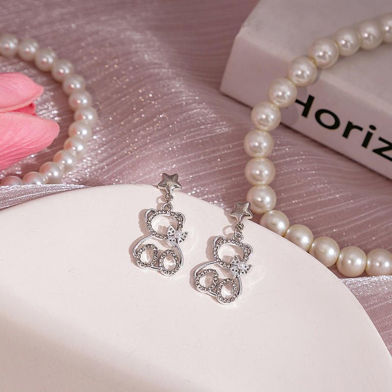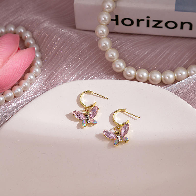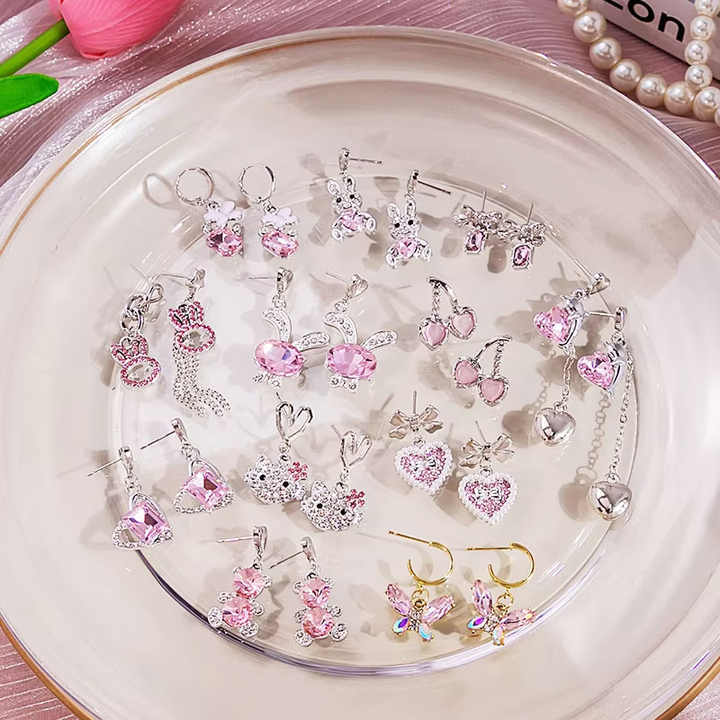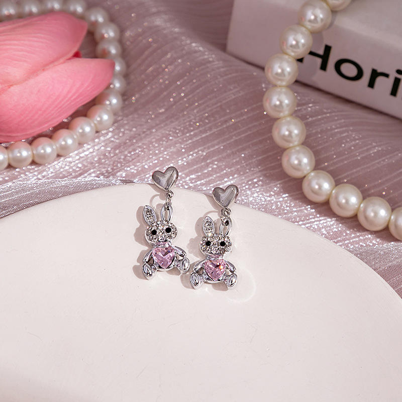 ต่างหูเม็ดเดี่ยวดีไซน์รูปการ์ตูนน่ารักแฟชั่นเกาหลีต่างหู925รูปผีเสื้อรูปกระต่ายหินสีชมพูเงิน