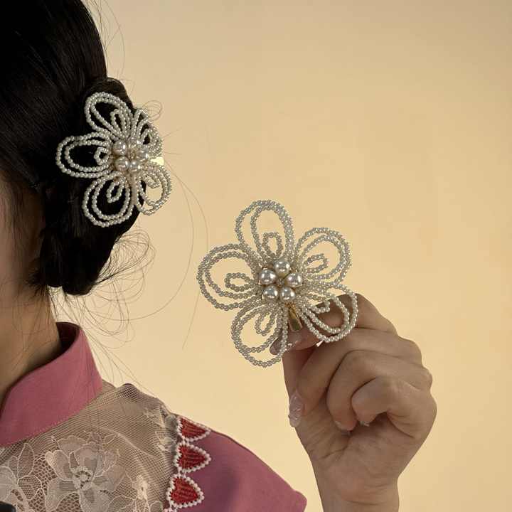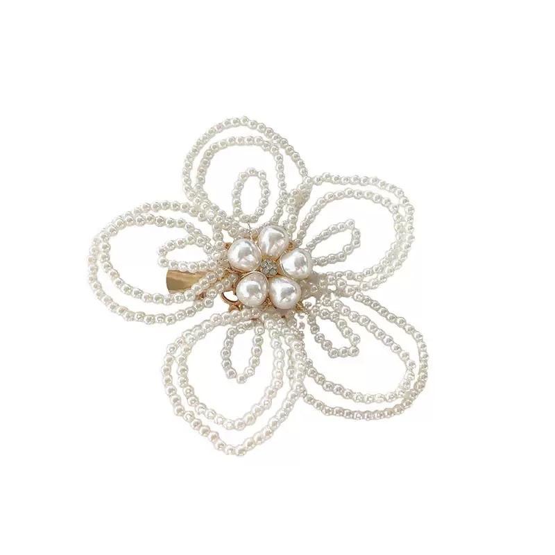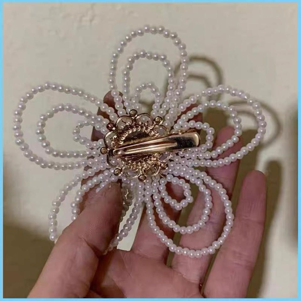 กิ๊บติดผมรูปดอกไม้มุกหรูหราสไตล์เกาหลีสำหรับผู้หญิง ทำจากพลาสติก พร้อมโบว์โลหะ