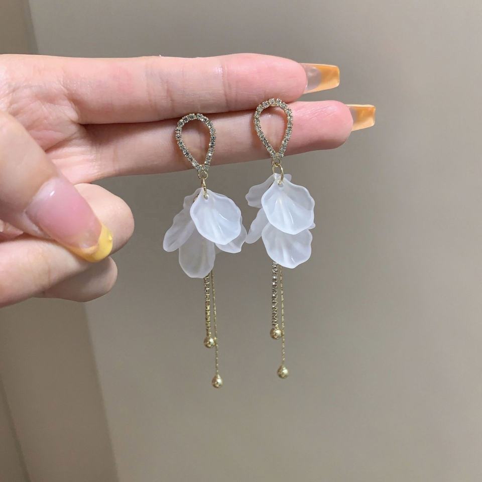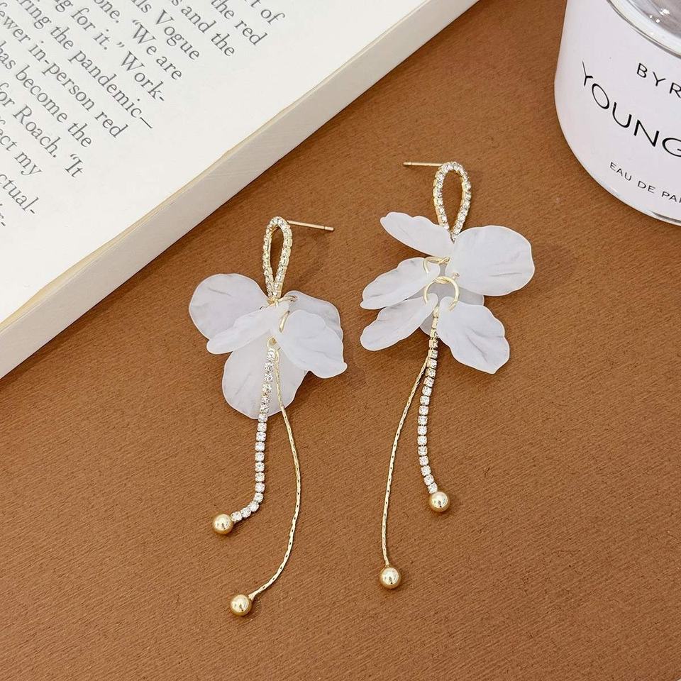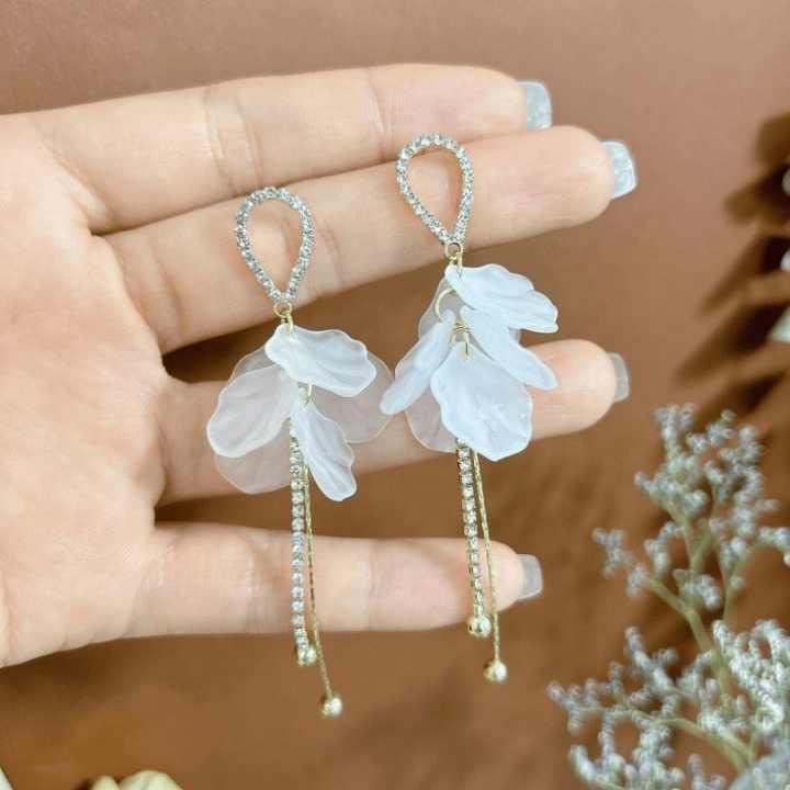 ต่างหูระย้ารูปกลีบดอกไม้สีขาวสไตล์เกาหลีสำหรับผู้หญิง ประดับเพชรซิร์คอนชุบทอง ดีไซน์หรูหรา เหมาะสำหรับงานแต่งงานและงานปาร์ตี้