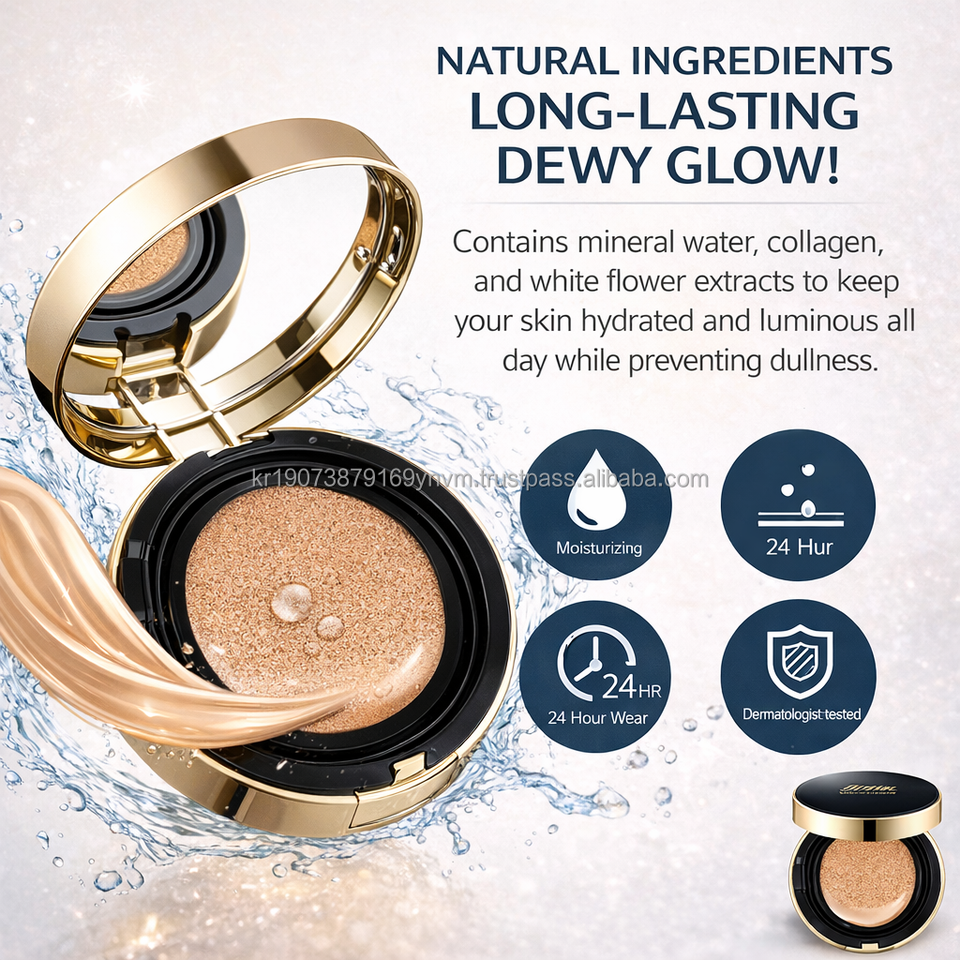 รองพื้นบีบีคุชชั่นเกาหลี สูตรผิวกระจ่างใส SPF50+ สำหรับทุกสภาพผิว รับผลิตแบรนด์ส่วนตัว ปริมาณมากกว่า 1.7 ออนซ์ พร้อม MSDS