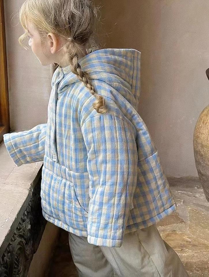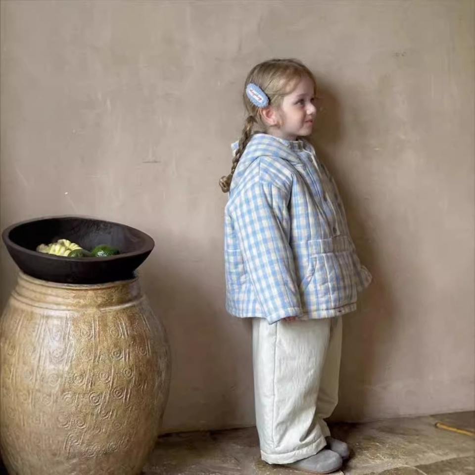 ชุดเสื้อผ้าสำหรับเด็กสไตล์เกาหลีพร้อมฮู้ดลายตารางหมากรุกสีฟ้าสำหรับเด็กผู้หญิงเสื้อโค้ทผ้าฝ้ายสีทึบกางเกงสำหรับฤดูหนาว