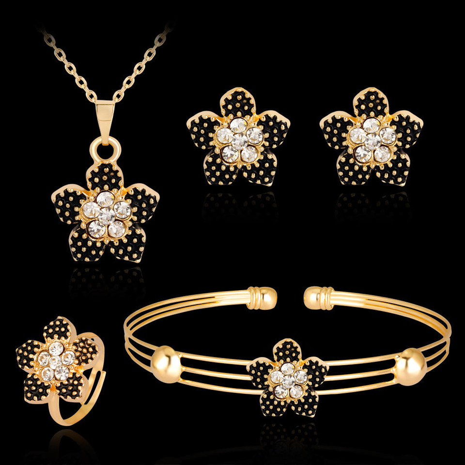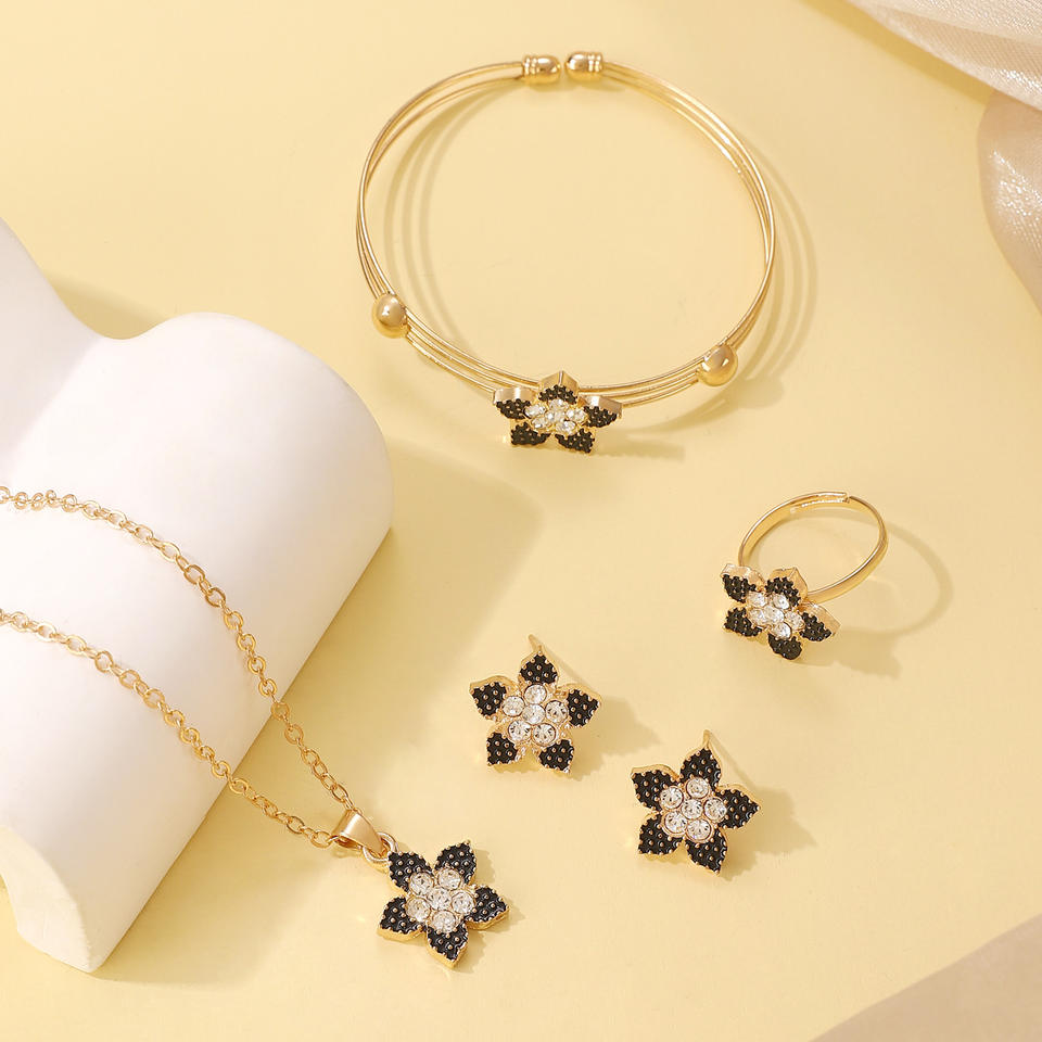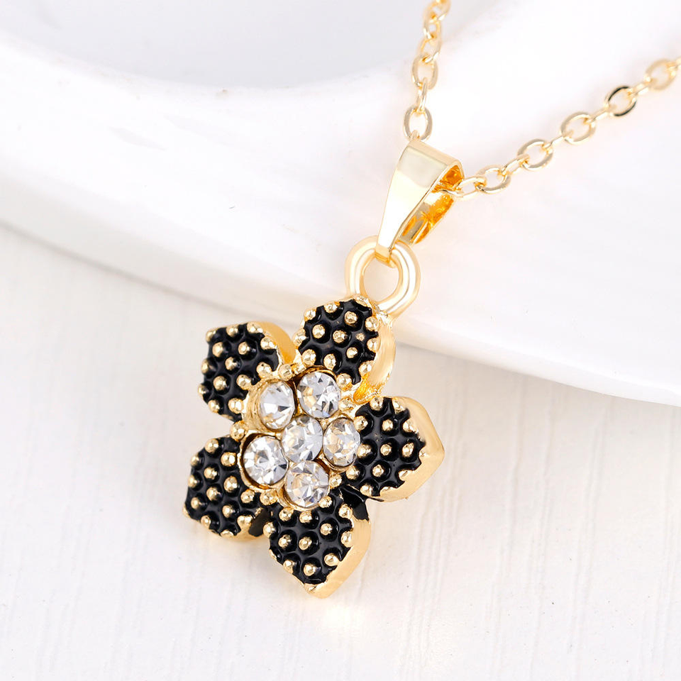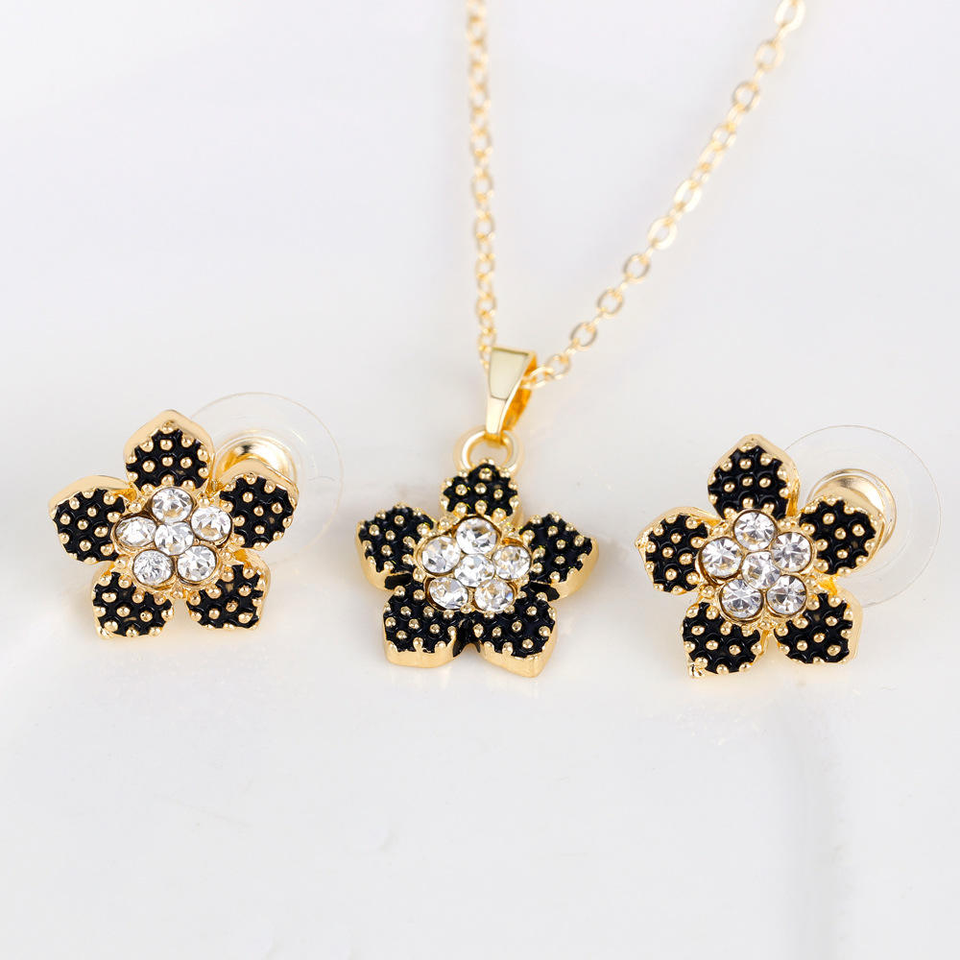 ชุดเครื่องประดับผู้หญิงสไตล์เกาหลีน่ารัก สีดำลายหยดน้ำรูปดอกไม้ห้ากลีบ ประดับเพชร วัสดุอัลลอยด์ สร้อยคอ ต่างหู