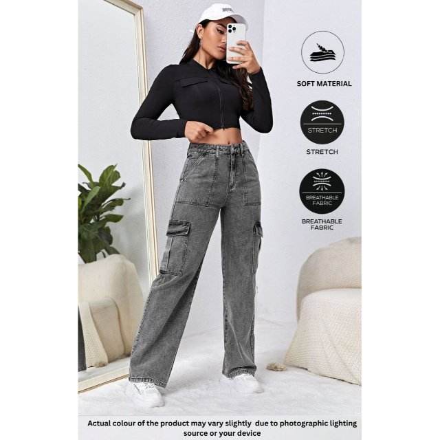 Fit Type: Multipocket Denim Cargo Jeans, Waist Type: High Waist., Fabric: Stretch Denim (Cotton + Stretch Denim)., Length: Full Length (Approx. 40 inches)., Closure Type: Zipper Fly with Metal Button., Pattern Type: Solid / Plain., Pocket Type: 6-Pocket Classic Design., Stitching: Double-Needle Durable Stitch., Details: Clean Look / Minimalist Finish / Premium Thread Work., Fabric Features: Breathable., Wash Type: Enzyme Wash / Soft Finish., Usage: Casual Wear.