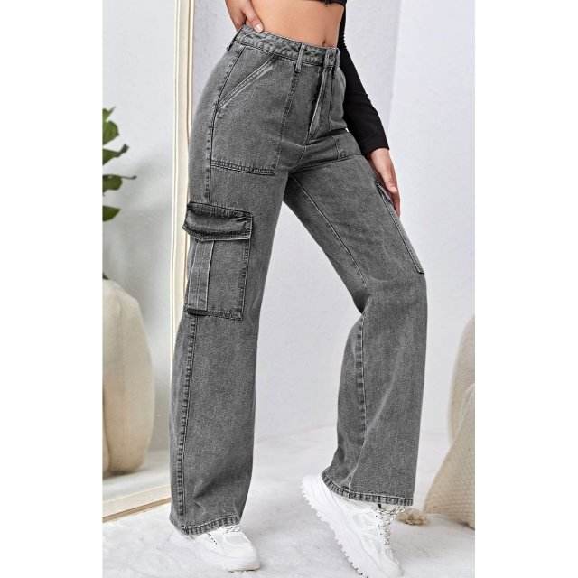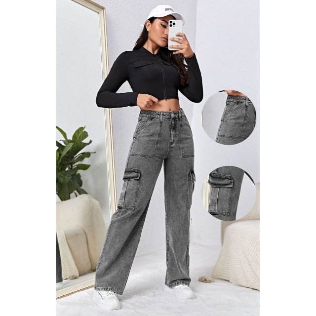 กางเกงยีนส์เดนิมทรงคาร์โก้สีเทาสำหรับผู้หญิงสไตล์เกาหลีเอวสูง ผ้ายืด ทนทาน มีกระเป๋าหลายช่อง แฟชั่นสตรีทแวร์สุดฮิต