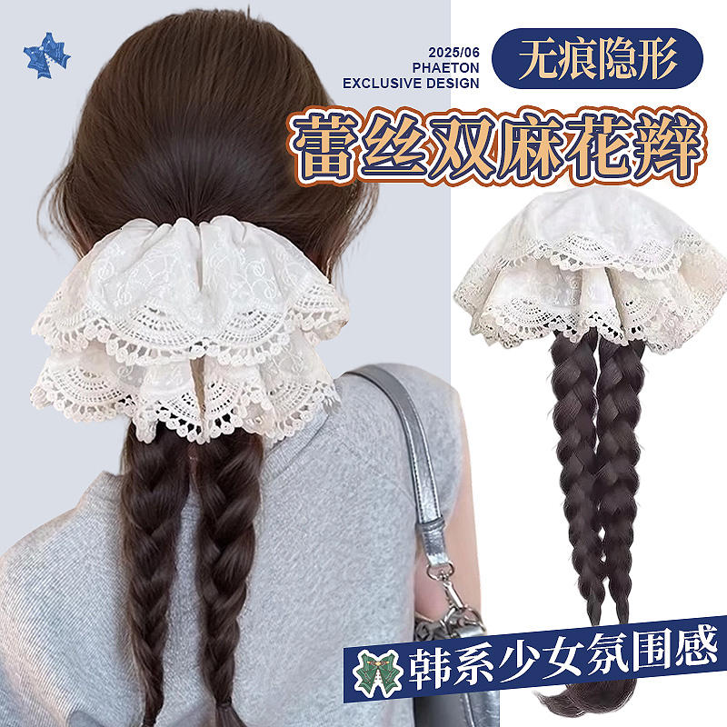 วิกผมถักเปียยาวสไตล์เกาหลีพร้อมคลิปติดผมแบบลูกไม้เปียคู่สีขาวแบบไม่ต้องใช้กาวอุปกรณ์เสริมผมสังเคราะห์
