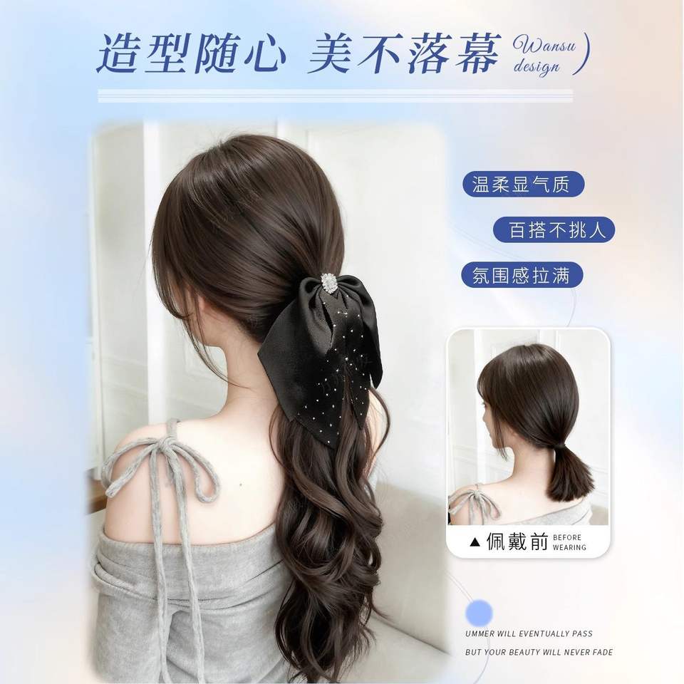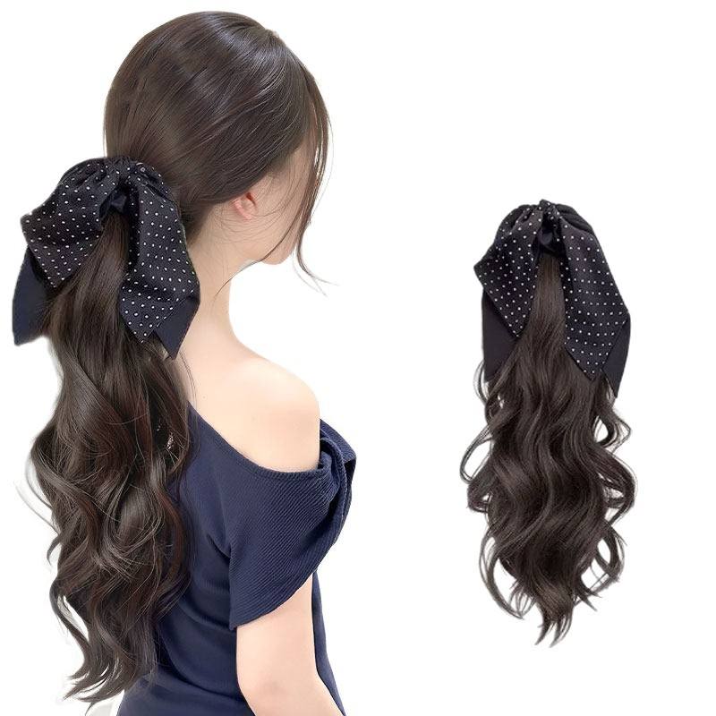 วิกผมหางม้าสไตล์เกาหลีสำหรับผู้หญิงผมยาวหยิกคลื่นลายจุดโบว์คลิปออนใยสังเคราะห์คาเนคาลอน 40 ซม. 105 กรัม ไม่ต้องใช้กาว