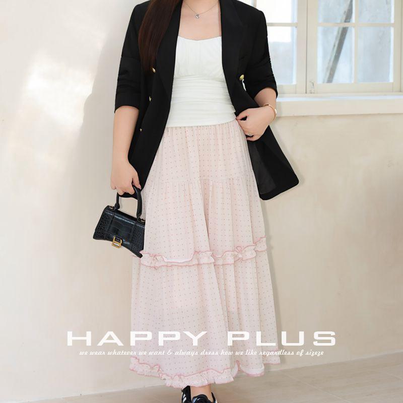 กระโปรงมิดิทรงเค้กสไตล์เกาหลีสำหรับผู้หญิง สีชมพูลายจุด ผ้าชีฟอง เอวยางยืด ไซส์พลัส สไตล์ลำลอง สาวหวาน