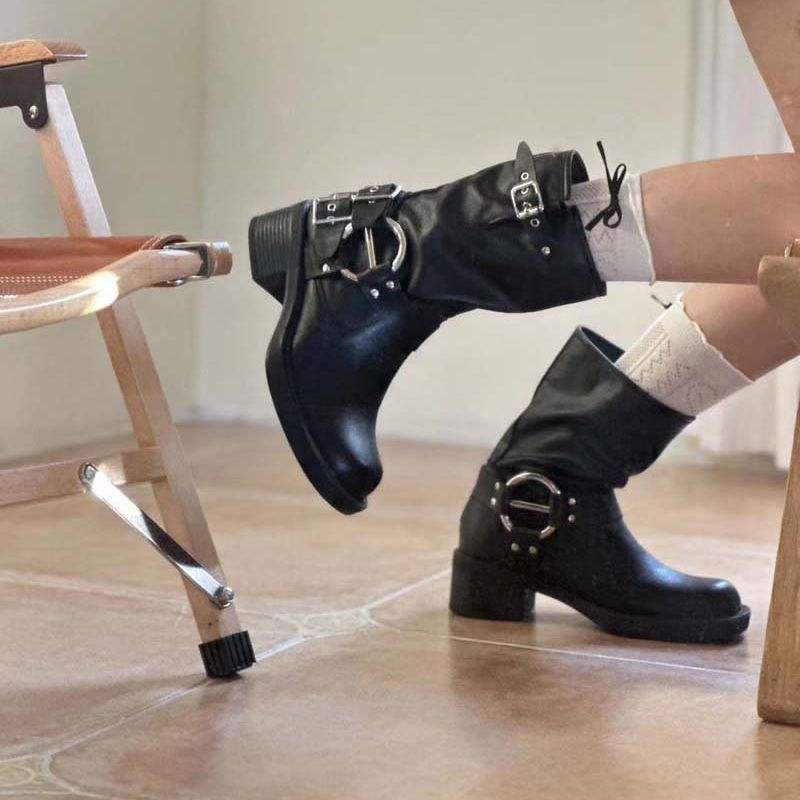 รองเท้าบูทสไตล์เกาหลีแบบตะวันตก สไตล์เรโทรอังกฤษ แฟชั่นมาใหม่ฤดูใบไม้ร่วง รองเท้าส้นตึกประดับหมุดพร้อมสายรัดหนังแกะ สวมใส่ง่าย