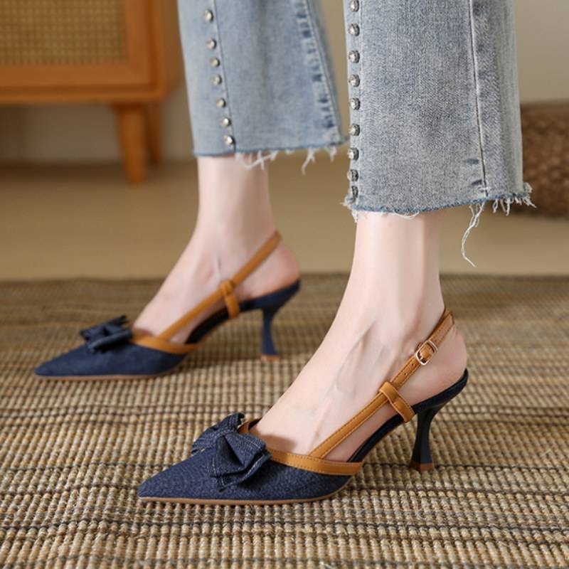 รองเท้าสไตล์เกาหลี หรูหรา ปี 2025 รองเท้าส้นสูงแบบสลิงแบ็ค แฟชั่น รองเท้าส้นแหลม รองเท้าส้นสูงผู้หญิง รองเท้าส้นสูงแบบผูกโบว์ ส้นบาง รองเท้าส้นสูงแบบดอร์เซย์ ทำจากหนัง PU